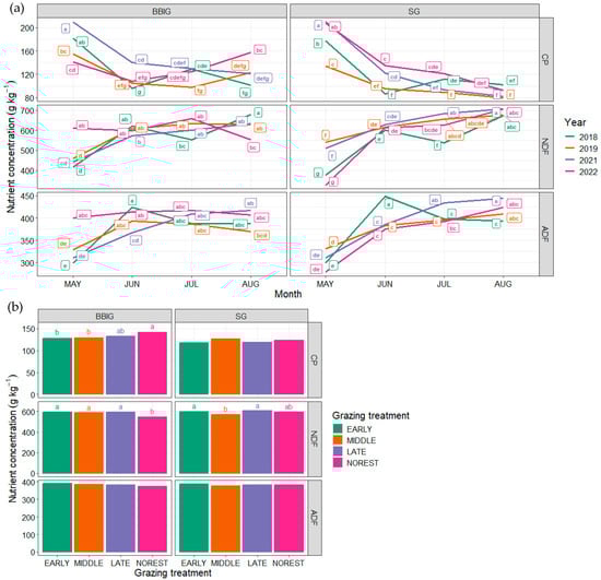 Crude protein, NDF, and ADF were each reliant on two-way interactions between month and year in both BBIG (p < 0.01; Figure 6a) and SG (p < 0.01). Crude protein tended to decrease as each season progressed, while both NDF and ADF increased. Crude protein and NDF were also dependent on grazing treatment (p < 0.05; Figure 6b).