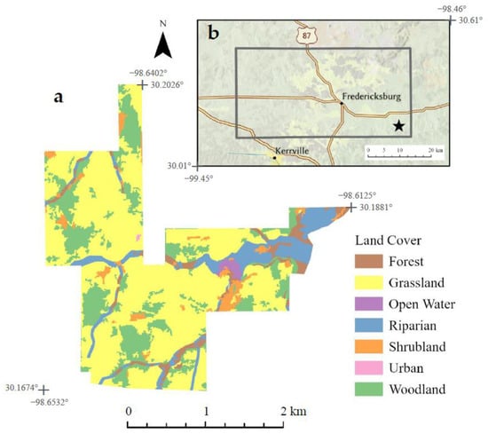 Gillespie County study area (red rectangle) in Texas, USA (a) and land cover map of Gillespie County (b) using Ecological Mapping System of Texas [].