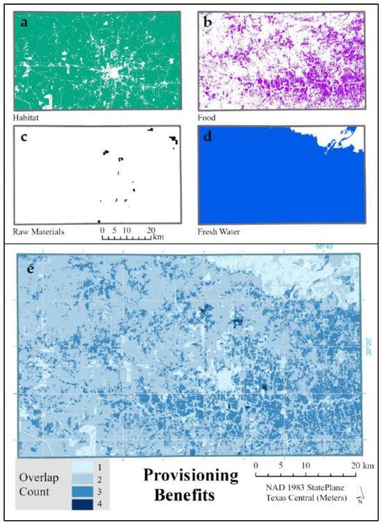 Provisioning ES benefits overlay maps of Gillespie County. Small maps on top show land contributing to habitat (a), food/fiber (b), raw materials (c), and freshwater (d). Large map on bottom displays the overlay of these benefits with values representing overlap counts (e).