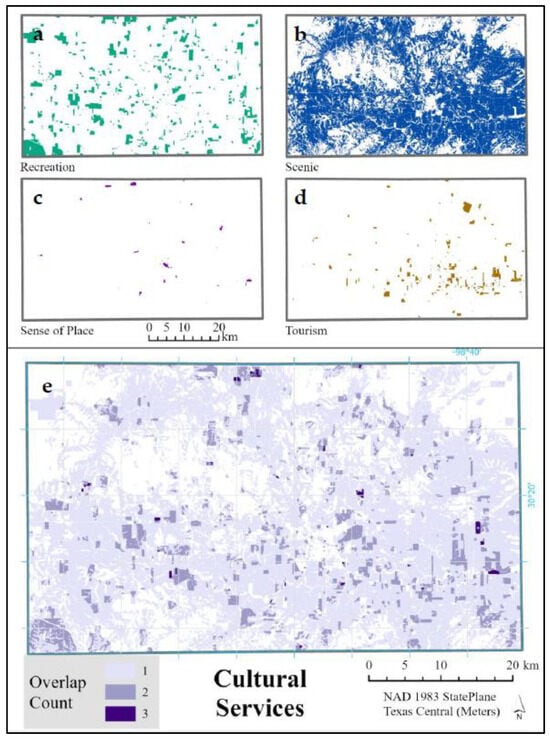 Cultural ES benefits overlay maps of Gillespie County. Small maps on top show land contributing recreation (a), aesthetics (b), sense of place (c), and tourism (d). Large map on bottom displays the overlay of benefits with values representing overlap counts (e).