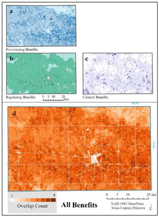 Summation of all benefits for Gillespie County. Small maps on top created from overlays of provisioning (a), regulating (b), and cultural benefits (c). Large map on bottom displays the overlay of all benefits with values representing overlap counts (d).