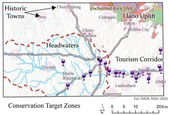 Wine, peaches, and other crops are integral parts of Gillespie County’s cultural landscape but take up a small portion of its land area. The vast majority of the county is used for ranching operations. Water needs are met primarily from groundwater, with the Edwards–Trinity aquifer being the principal source. Aside from food provisioning, the predominance of rangeland—a low-intensity agricultural land use—functions as habitat for a diversity of flora and fauna []. Abundant vegetation also contributes to soil protection, water quality, flood control, and climate and air quality regulation []. In sum, Gillespie County was selected for our study area because it is a working lands landscape that provides a multitude of benefits to both nature and society and is located within a broader region that is experiencing widespread and rapid land use changes.