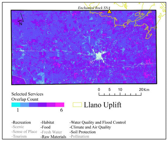 The combination of all provisioning, regulating, and cultural benefits had a potential maximum overlap count of 12, one for each layer. The entire county was mapped as providing at least one benefit, and the maximum value attained was nine benefits (Table 5). Extreme values were uncommon and only occurred where highs or lows were consistent across benefit categories (Figure 6). The highest values were concentrated along the Pedernales River (largely from provisioning and regulating benefits) and State Highway 290 (largely from cultural benefits). This region also contained many of the isolated patches of high values (eight or nine benefits), highlighting locations with many overlapping benefits (e.g., LBJ National Historic Park). The part of the county with the lowest total value was the town of Fredericksburg (Figure 6). For the most part, this highly developed area only produced the one benefit of tourism. The northeast corner of Gillespie County had relatively low overlap values, with most of this region only providing the three benefits of habitat, climate/air quality, and soil protection.