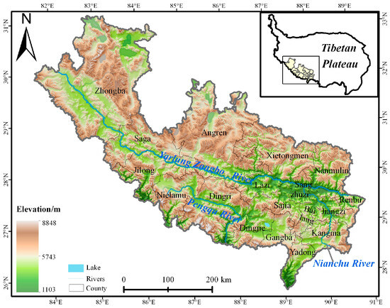 The Rikaze area, situated in the Southern Tibetan Plateau and the southwestern part of the Tibet Autonomous Region, is bordered by Lhasa to the east and Ngari to the west and shares borders with India, Nepal, and Bhutan to the south (Figure 1). Situated between the Himalayas and the Kailas Range Mountains, the area features a rugged and complex terrain characterized by high mountains, expansive valleys, and lake basins. It boasts an average elevation exceeding 4000 m, abundant sunlight with over 3300 h of annual sunshine, and a mild climate with a frost-free period of approximately 120 days. The average annual temperature ranges from 7 to 9 °C, with most precipitation occurring between July and August. The area boasts a rich network of rivers, notably the Yarlung Zangbo River, Nianchu River, and Pengqu River, which are vital in supporting agricultural development. Dating back to the Paleolithic era, the Rikaze area has served as a vital area for agricultural activities [29]. The discovery of highland barley seeds approximately 3200 years ago marked the onset of primitive agriculture in the area [30]. Around 1400 years ago, the advent of new farming tools and techniques spurred the extensive development of cropland, reaching a historical zenith. Around 1200 years ago, the Tubo regime collapsed, leading to a prolonged era of subdued agricultural activity. Around 800 years ago, the Yuan dynasty’s unification of the Tibetan administration led to relative societal stability, catalyzing the restoration and development of agriculture. Around 600 years ago, this stability further facilitated the gradual recovery of agriculture and the expansion of cropland. Around 300 years ago, despite the impacts of war and exploitation, agriculture still developed to a certain extent, providing a basic guarantee for the survival of local residents. Thanks to its natural advantages, such as abundant sunlight and rivers, and its long history of agricultural development, the Rikaze area is often referred to as the ‘Granary of Tibet’. Agriculture has consistently been a cornerstone of local economic and social progress [31,32].