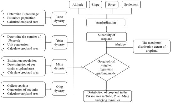 The overall research framework of this study is shown in Figure 2. In this work, the cropland areas during the Tubo, Yuan, Ming, and Qing dynasties were estimated utilizing historical population and tax data. Subsequently, employing the gridding reconstruction method of GWR, the estimated cropland areas were spatially allocated to generate a spatial distribution map.