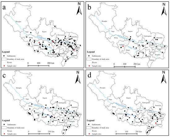 Settlement distribution maps of (a) Tubo, (b) Yuan, (c) Ming, and (d) Qing dynasties in the Rikaze area.