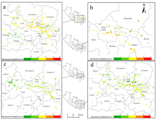 Cropland distribution in the (a) Tubo, (b) Yuan, (c) Ming, and (d) Qing dynasties in the Rikaze area of China. The raster data are available in Supplementary File S1.