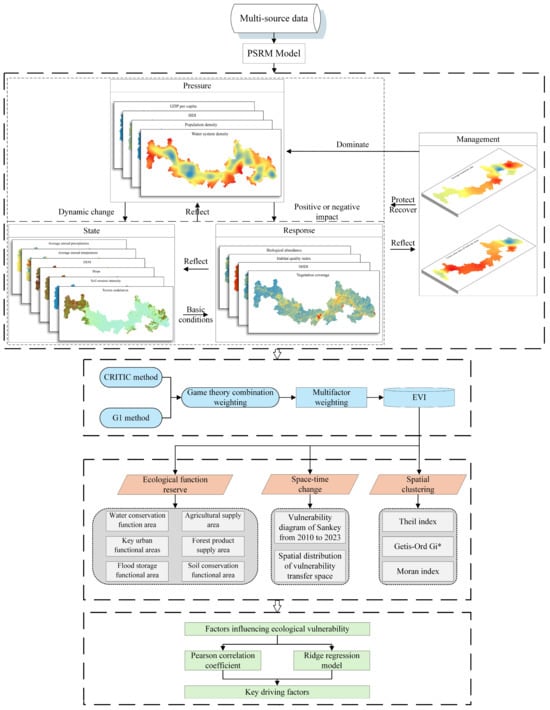 The principal contributions of this study are as follows: (1) A comprehensive multidimensional ecological vulnerability assessment framework was developed by integrating the G1–CRITIC–game theory combination weighting with the Pressure–State–Response–Management (PSRM) model. This approach overcomes the limitations of conventional methods in the coupling analysis of complex human–environment systems, achieving dynamic equilibrium between subjective and objective weights and enabling multidimensional vulnerability evaluation. (2) The spatiotemporal evolution patterns of ecological vulnerability in the Hubei section of YREB from 2010 to 2023 were systematically quantified, addressing gaps in traditional methods for analyzing coupled complex systems. (3) The spatial heterogeneity driving mechanisms of ecological vulnerability were elucidated through the combined application of the Theil index, hot-spot analysis, and ridge regression modeling, filling the research void in the high-precision dynamic monitoring and attribution analysis of ecological vulnerability in this region. This methodological framework effectively addresses the issues of fixed weighting and mechanistic rigidity inherent in conventional models for assessing vulnerability within complex human–environment coupled systems, thereby achieving a methodological breakthrough in ecological vulnerability evaluation at the watershed scale. These findings provide a scientific foundation for advancing the construction of an ecological civilization demonstration zone and formulating targeted environmental protection policies in the Hubei section, thereby promoting the balanced and coordinated development of the economy–society–ecology nexus. The technical workflow is illustrated in Figure 1.
