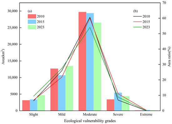 Area (a) and proportion (b) of ecological vulnerability grades from 2010 to 2023.