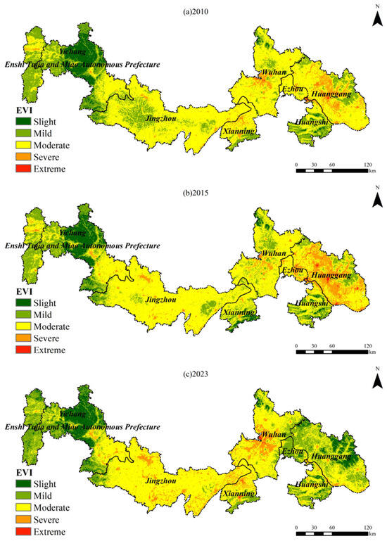 Spatially, the EVI of the Hubei section of the YREB during 2010 and 2015 exhibited a distinct east–central high and west low distribution pattern, as illustrated in Figure 4. Cities along the Yangtze River mainstream—including Jingzhou, Wuhan, Ezhou, Huanggang, and northern Xianning—exhibited moderate to severe vulnerability grades due to rapid industrialization and urbanization. In contrast, regions such as Enshi Tujia and the Miao Autonomous Prefecture, western Yichang, and Huangshi, characterized by high forest coverage rates and low human disturbance intensity, maintained slight to mild vulnerability grades over this period. By 2023, the spatial pattern shifted to a central-to-peripheral gradient decline, reflecting overall improvements in ecological quality compared to 2015. The mild vulnerability area in western Enshi expanded substantially, while moderate, severe, and extreme vulnerability areas in the east largely transitioned to slight and mild grades. For instance, Wuhan and Ezhou shifted from severe to mild vulnerability, and Huangshi and Huanggang transitioned from moderate to mild vulnerability.