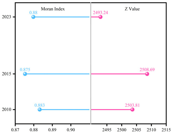 From 2010 to 2023, the spatial pattern of ecological vulnerability in the Hubei section of the YREB showed a centralized distribution, with the degree of spatial agglomeration decreasing and then increasing. The Theil index decreased from 0.371 in 2010 to 0.365 in 2015, indicating that the degree of spatial agglomeration was slightly weakened, and the spatial pattern tended to be randomly distributed. The Theil index increased to 0.398 in 2023, indicating an overall enhancement of spatial agglomeration and demonstrating strong interactive effects on ecological vulnerability within the study area. In order to verify the reasonableness of the calculation results of the Theil index, the Moran index was used for testing, and the results are shown in Figure 5. From 2010 to 2023, the Moran index values were 0.883, 0.875, and 0.88, respectively. Both the Theil index and Moran’s I exhibited a “V”-shaped fluctuation trend. Furthermore, the Moran index results showed a p-value of less than 0.01 and a Z-score greater than 1.96, confirming that the Theil index calculations adhere to statistical principles and demonstrate significant clustering characteristics.