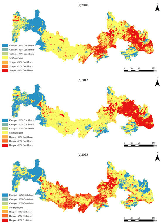 Spatial distribution of hot- and cold-spots in Hubei section of YREB from 2010 to 2023.