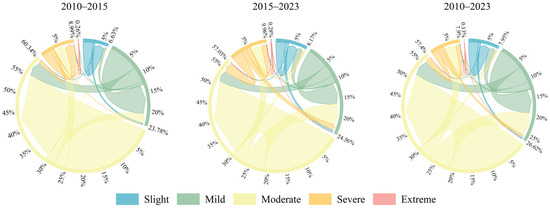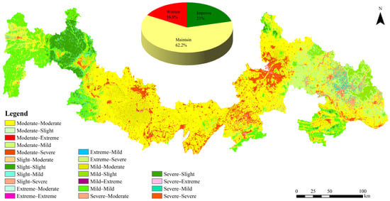 Between 2010 and 2023, 62.2% of the study area maintained the current vulnerability level, 21% of the area shifted to a low vulnerability level, and 16.8% of the area increased in vulnerability level, as shown in Figure 8. In terms of the spatial distribution pattern, the central plains area maintained a moderate vulnerability grade in general, and some towns and cities shifted from moderate and severe to severe and extreme vulnerability grades. The western region had a large area of declining ecological vulnerability, which was mainly characterized by the trend of “moderate–mild” and “mild–slight”, with some areas remaining slightly or mildly vulnerable. In the eastern region, the type of vulnerability transformation was more complex, with an overall shift from vulnerability to low vulnerability, which was reflected in the shift from severe, moderate, and mild vulnerability to moderate, mild, and slight vulnerability, respectively. Due to the large number and decentralized distribution of land use types in the region, there were various types of ecological vulnerability level transformations.