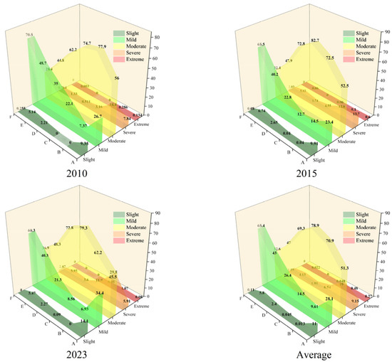 From 2010 to 2023, the ecological vulnerability of the Hubei section of the YREB shows a trend of increasing and then decreasing, with an overall decreasing trend, as shown in Figure 3. The region as a whole is dominated by moderate vulnerability, with the proportion of moderately vulnerable areas being 60.7%, 59.9%, and 54.1% in 2010, 2015, and 2023, respectively. From 2010 to 2015, the areas of slight, severe, and extreme vulnerability increased by 223.82 km2, 2019.6 km2, and 145.26 km2, with the proportion of the areas increasing by 0.48%, 4.12% and 0.30%, respectively; the mildly and moderately fragile area decreased by 2026.17 km2 and 353.88 km2, respectively, accounting for 4.15% and 0.75%, respectively. The severe vulnerability area had the largest growth, the mild vulnerability area was obviously reduced, and ecological vulnerability increased. From 2015 to 2023, the areas of slight and mild vulnerability increased by 1280.16 km2 and 2802.06 km2, respectively, and their proportion increased by 2.61% and 5.7%, respectively. The moderately, severely, and extremely vulnerable areas decreased by 2860.2 km2, 1064.07 km2, and 123.21 km2, respectively, and their proportion decreased by 5.88%, 2.18%, and 0.25%, respectively. Among them, the minimally and mildly vulnerable areas increased substantially, the moderately, severely, and extremely vulnerable areas decreased greatly, and the moderately, severely, and extremely vulnerable types shifted to the minimally and mildly vulnerable types, resulting in a significant reduction in ecological vulnerability and a sustained improvement in the ecological environment.