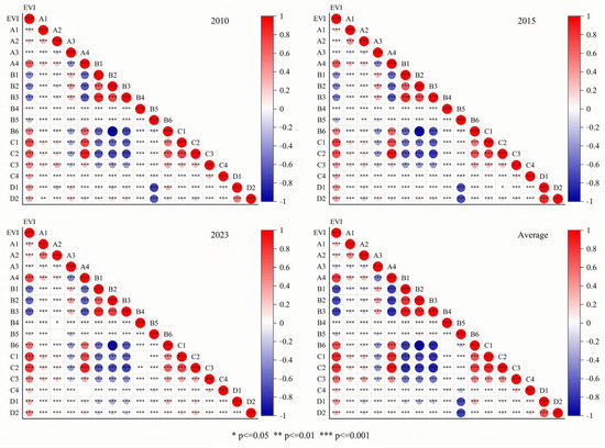 The results of the correlation coefficient calculation are shown in Figure 11. Except for B4 and B6, the p-value of each indicator is less than 0.001, which indicates that it is significantly correlated at the 99.9% confidence level, and the correlation between the indicators is strong. The selection of indicators meets the modeling criteria for the interaction between indicators and has regression significance. According to the covariance diagnostic (Table 4), the VIF values of indicators A4, B1, B2, B3, B6, and C2 are all greater than 7.5, indicating that there is a more obvious multiple covariance between the above indicators. If the conventional method was chosen to analyze the contribution of the factors at this time, it would lead to a decrease in the accuracy of the calculation, affecting the results of the analysis. Therefore, ridge regression was chosen for the calculation of the indicator driving force in this study.