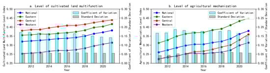 Trend of changes in levels of cultivated land multifunction and agricultural mechanization in China from 2011 to 2021.