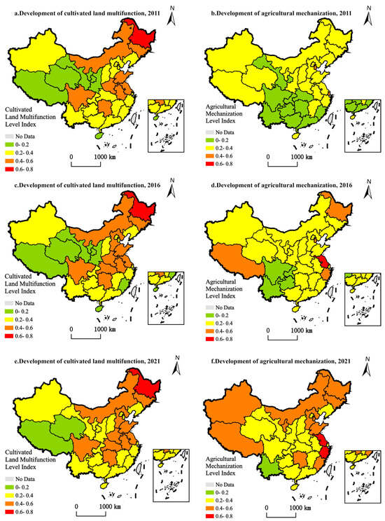 Spatial pattern of levels of cultivated land multifunction and agricultural mechanization in China from 2011 to 2021.