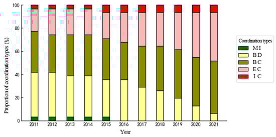 According to the coordination type classification, the proportion of provinces in medium-level and primary coordination in China gradually increased, while the proportion of mild disorder and near-disorder provinces gradually decreased. Since 2016, there have been no provinces in the mild disorder category (Figure 5).