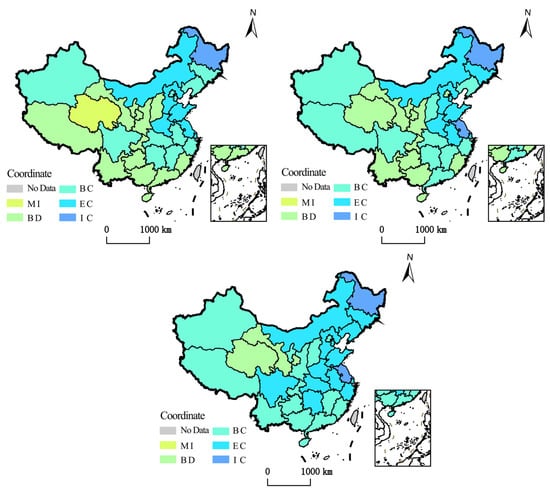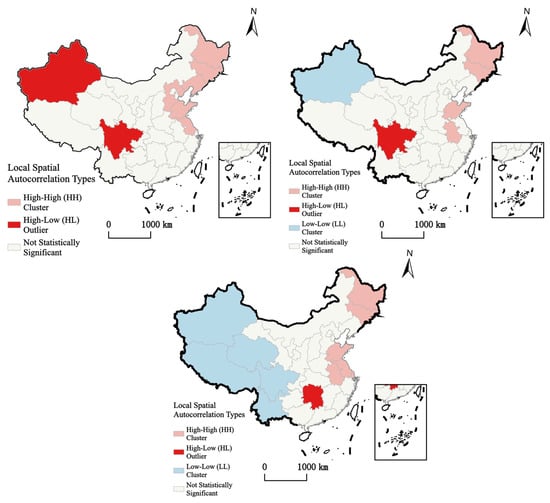 Significant HH types remained in Heilongjiang and Jilin provinces in the Northeast; Jiangsu, Zhejiang, and Anhui provinces; and Shanghai in East China. These regions maintained high coordination levels with consistent internal and external coordination, forming significant agglomeration effects. However, compared to 2011, the significant HH types were now concentrated in Northeast and East China, unable to form a continuous agglomeration effect (Figure 8).