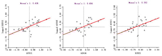 Local Moran scatter plot of coordination degree between cultivated land multifunction and agricultural mechanization in China from 2011 to 2021.The Local Moran's I scatter plot depicts the spatial distribution of standardized observed values (x-axis) and their spatial lags (y-axis), divided into four quadrants by intersecting dashed lines (passing through the origin): (1) HH quadrant indicates high local values surrounded by high regional values; (2) LH quadrant represents low local values amid high-value neighboring regions; (3) LL quadrant shows low local values surrounded by low regional values; (4) HL quadrant depicts high local values surrounded by low-value regions. The red diagonal line represents the regression line's slope, revealing the linear relationship between observed and spatial lagged values.