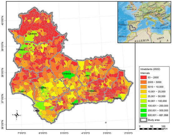 The area chosen for this study is the autonomous communities of Andalusia and Extremadura (Spain), located in southern Spain and on the border with Portugal. It was chosen because since the middle of the 20th century, a large part of rural Spain has experienced an unprecedented demographic exodus. Although this is a phenomenon that manifests mainly in the northern half of the country, there are territories located on the southern slope in which the intensity of depopulation gives them a special particularity [64,65]. On the one hand, Andalusia and Extremadura have different levels of ageing, although not as distorted as those of other autonomous communities in the south of the peninsula, such as Castilla-La Mancha, conditioned in some areas by Madrid, the capital of the country and the most populated city, or the community of Murcia, a single-province community with a smaller area, to test the effects of spatial statistics. Moreover, as reflected in the literature, ageing is inexorably advancing towards the south of Spain [64].