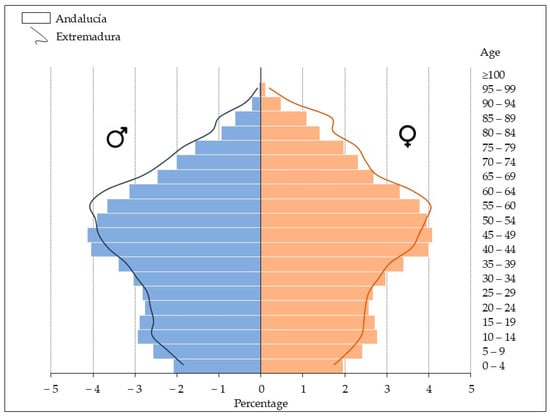 Although the resident population is very different between the two, their demographic structures (Figure 2) are very similar, though in the case of Extremadura, greater ageing is detected. In fact, its ageing index reaches 164.85‰, while in the Andalusian case, it is 122.38‰; meanwhile, the national average is 142.35‰ [68].