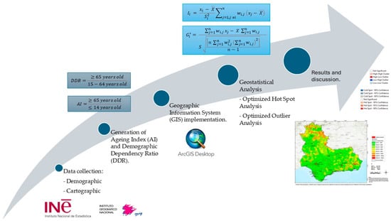 The workflow during this research followed the scheme below, which synthesizes the sources (INE and IGN), the calculation of the basic information for this study, and its implementation in a Geographic Information System, in addition to the use of spatial statistical techniques. This process made it possible to establish results and promote discussion (Figure 3).