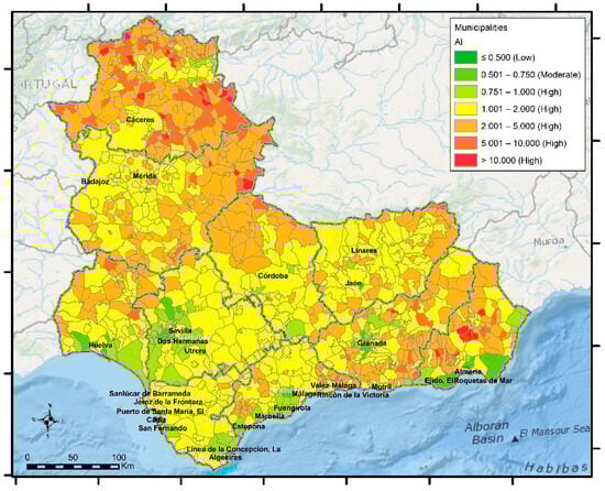 To optimize the result, both techniques automatically evaluate the characteristics of the input entity class, in this case, the municipalities. To obtain the best possible result, both techniques resort to Incremental Spatial Autocorrelation, with the objective of detecting the threshold distance where the spatial processes that promote clustering are more intense [78]. This is estimated to be 32,686 m. Furthermore, in the specific case of Outlier Analysis, the balanced performance tuning option is chosen. Specifically, with 499 permutations, the smallest possible pseudo p-value is 0.002 and the other pseudo p-values will be even multiples of this value.