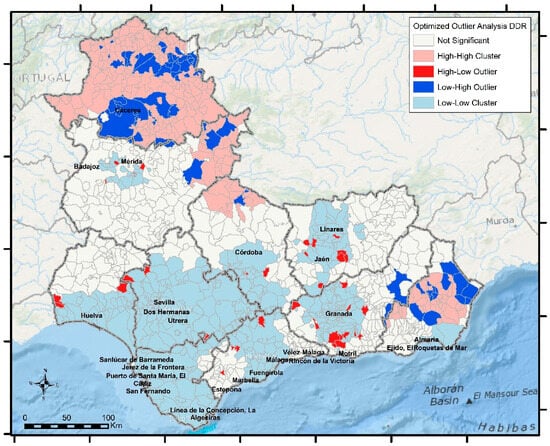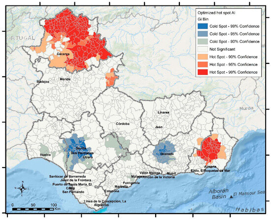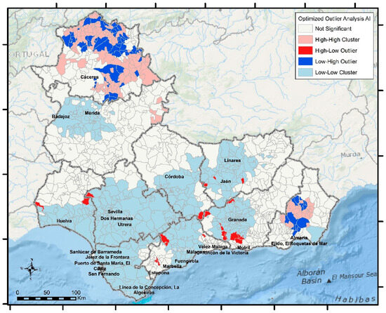 The latter uses mapping cluster tools integrated into ArcGIS 10.8 software and widely used in the scientific community, as revealed in the literature. They allow for detecting critical points, where the analyzed variable reaches high or low values in a set of neighboring or, at least, very close entities (municipalities). Similarly, they are used to detect outliers. Specifically, among the different techniques that make up the spatial statistics toolbox of this software, two of them are used. These are Optimized Hot Spot Analysis and Optimized Outlier Analysis, used in a complementary way in numerous publications [72,73,74].