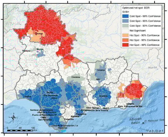 The first consists of an algorithm that generates a map of hot and cold spots using the Getis–Ord Gi* statistic [75]. It has been used in the analysis of population distribution by the literature [76], along with other techniques of local demography and spatial analysis [77]. The second creates a map of hot and cold spots and includes outliers using the Anselin Local Moran’s I statistic.