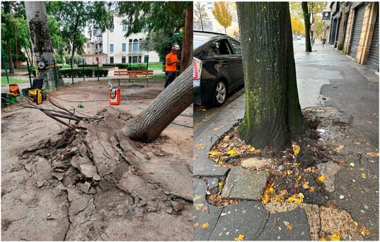 26], the conflict with urban infrastructure (e.g., trees can block traffic signs, streetlights, and views, reducing visibility and safety), the intrusion and outcropping of roots that can break sidewalks, roads, and building foundations, and the risk of uprooting and crashing, especially in high winds. The latter occurrences are often aggravated by various stresses, particularly abiotic factors, to which city trees are frequently exposed. These include soil compaction and paving over the root zone that reduces gas exchange and rainwater infiltration, planting in soils poor in organic matter, high temperatures, pollution, and incorrect management activities, especially pruning (