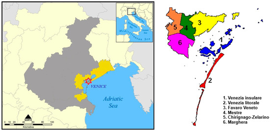 The metropolitan City of Venice, located in north-eastern Italy, was chosen as a case study (45°26′23″ N 12°19′55″ E). Venice’s unique history, artistic heritage, and urban landscape led to its designation as a UNESCO World Heritage Site. The City of Venice has approximately 260,000 inhabitants, unevenly distributed across an area of 415.9 km2 (including the lagoon area).
