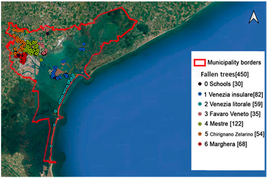 Figure 10—that the fallen trees are predominantly concentrated in the municipalities of Mestre and Marghera. They tend to cluster in groups within a radius of approximately 1 km, with the sole exception being three trees that fell in the Venezia litorale municipality.
