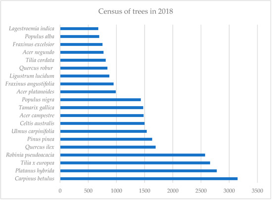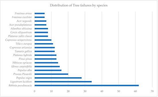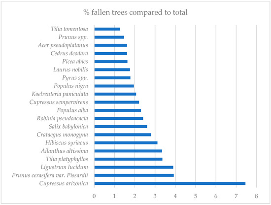 Figure 4 illustrates the 20 most prevalent tree species, out of a total of 74 species identified in the urban forest inventory, observed in 2018. This year serves as the baseline year for assessing fallen trees over the four-year study period. These species are characteristic of urban environments in the Po Valley and along the Italian coast, including notable examples such as
