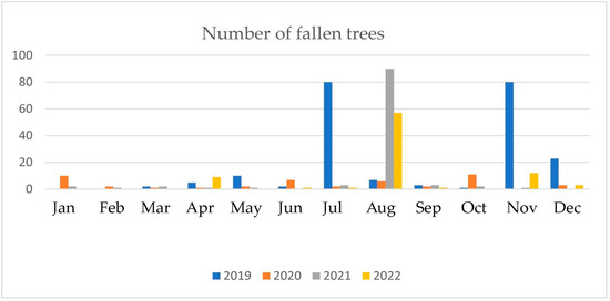Figure 5. As we can observe, the majority of the falls occurred during the summer months, particularly July and August, with the only exception of an abnormal extreme weather event occurring in November 2019. The most significant event occurred on the night between 16 and 17 August 2021, when 83 trees were felled. Although the precipitation in those days was relatively low (34 mm), high wind gusts were recorded with a peak of 26.8 m/s, a value close to that of a Category 12 hurricane on the Beaufort Wind Scale (speed of 32.5 m/s). The event on the night of 12 November 2019 occurred during a period of intense precipitation (more than 150 mm in a few days), but also with a maximum gust of 22.9 m/s, which was also the peak value for the year.