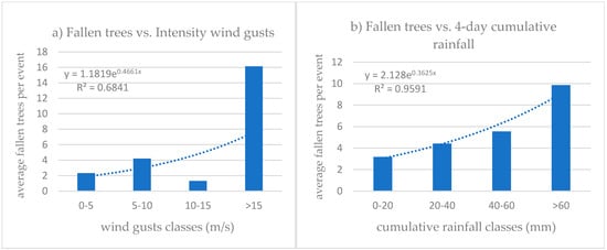 Moving on to consider the distribution of tree failures in relation to the environmental factors that characterized the weather events considered, it is easy to observe how the average number of fallen plants per event increases as the intensity of the wind gusts and the intensity of cumulative rainfall increase (