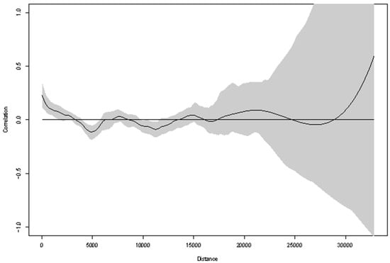 The spatial autocorrelation test results reveal a positive autocorrelation in the graph segment from 0 to approximately 1500 m (