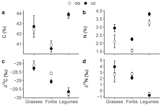 Means ± 1 standard error per PFT and canopy (open symbols indicate open grassland and solid symbols indicate under the canopy): (a) C content; (b) N content; (c) δ13C; and (d) δ15N.