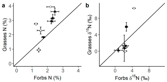 Relationship between (a) grass N content and forb N content and (b) grass δ15N and forb δ15N (shapes = ○●SM-ilex, □■DN-mixed, ▽▼DN-suber, △▲DN-pinea; open symbols indicate open grassland, and solid symbols indicate under the canopy). Mean ± 1 standard error. The diagonal line indicates a 1:1 relationship.