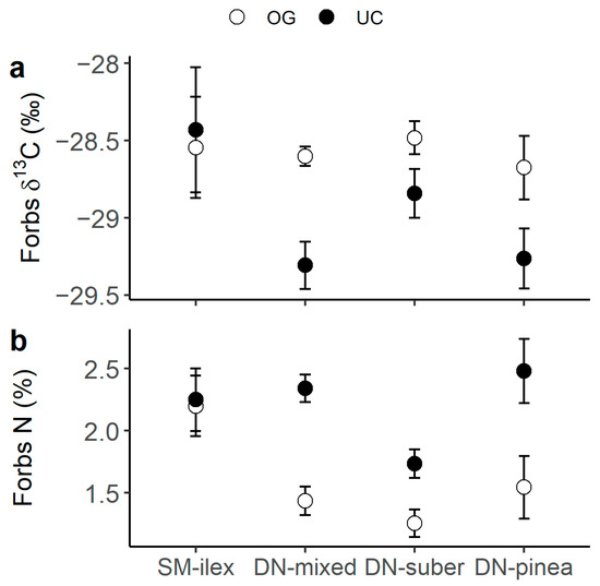 Our results also suggest that the canopy effect can be site-dependent when comparing locations along an altitudinal/climatic gradient. This is shown by the almost neutral canopy effect found on the δ13C and N content of forbs in SM-ilex, in contrast to the strong canopy effect detected in DN (DN-suber, DN-mixed, and DN-pinea, Figure 3). Interestingly, this pattern aligns with the canopy effect on the net ecosystem CO2 exchange patterns reported by [1]. The authors reported from the same study locations (i) a strong canopy effect in DN (DN-suber, DN-mixed, and DN-pinea), wherein there was net CO2 uptake in the open grassland but CO2 emissions under the canopy, while (ii) in SM-ilex, the canopy effect was neutral, and there was a net CO2 uptake both under the canopy and in the open grassland. These findings, combined with our δ13C values, suggest that the stomatal conductance is similar between both microenvironments in SM, therefore similar 13C discrimination rates are possible, in contrast to the strong differences found in DN, where more restrictive environmental conditions likely amplify the canopy effect. Furthermore, this suggests that under less restrictive environmental conditions, the microenvironment beneath the canopy is similar to the open grassland. However, as conditions become more restrictive, the canopy effect strengthens. This agrees with other authors that described a more pronounced canopy effect under more restrictive conditions, such as increased aridity [56] on soil fertility [57] and/or productivity [58].