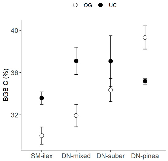 On the other hand, BGB had higher C content under the canopy than in the open grassland in all Quercus-species-dominated locations (SM-ilex, DN-mixed, DN-suber, Figure 4), while in the P. pinea-dominated region, the C content in the BGB decreased under the canopy compared to the open grassland (Table 2 and Figure 4).