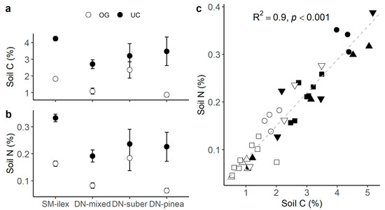 (a) Mean soil C ± 1 standard error; (b) mean soil N ± 1 standard error; and (c) relationship between soil C and soil N (shapes = ○●SM-ilex, □■DN-mixed, ▽▼DN-suber, △▲DN-pinea; open symbols indicate open grassland, and solid symbols indicate under the canopy). The diagonal slashed line indicates the linear trend.