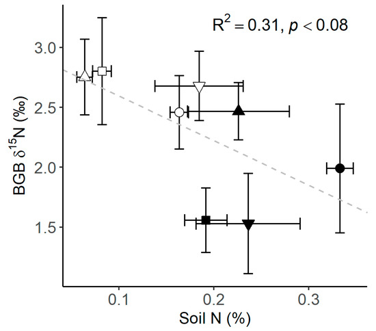 Relationship between soil N and belowground biomass (BGB) δ15N (shapes = ○●SM-ilex, □■DN-mixed, ▽▼DN-suber, △▲DN-pinea; open symbols indicate open grassland, and solid symbols indicate under the canopy). Mean ± 1 standard error; the diagonal slashed line indicates the linear trend.
