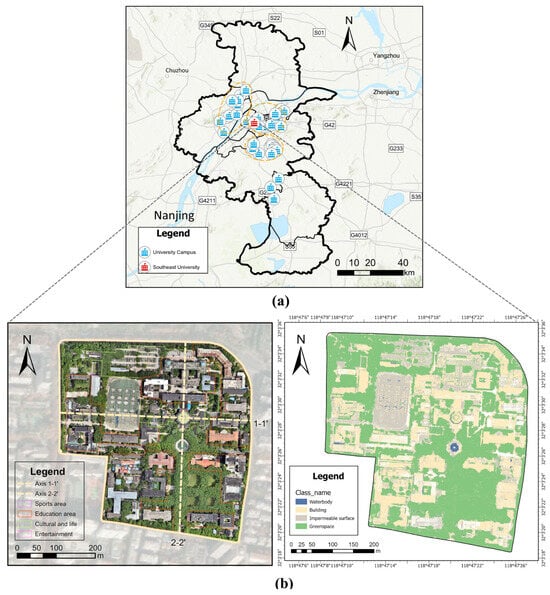 Nanjing is the capital of Jiangsu Province in eastern China, with a total area of 6587.04 square kilometers. It belongs to the subtropical humid monsoon climate zone with an average annual temperature of 17.6 °C. Recently, the meteorological records reveal an apparent warming trend, with summer temperatures reaching 31.3 °C in 2024. Therefore, it is necessary to mitigate the SUHI by optimizing the campus landscape design. Nanjing currently has more than 52 universities and 100 campuses, providing adequate research samples for urban heat island studies. In this research, we select the Sipailou Campus of Southeast University (longitude: 118.79, latitude: 32.05) as a representative case study in the metropolitan area, and its land use and spatial layout are shown in Figure 2. The total area of the campus is 41.1 hm2 and its high percentage of greenery (approximately 39%) has a potential cooling effect.