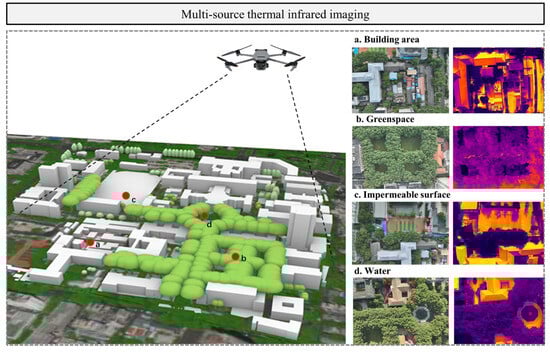 Field measurements of campus surface temperatures across different land use types (e.g., green spaces, buildings, impervious surfaces, and water bodies) by using UAV-based thermal infrared imaging.
