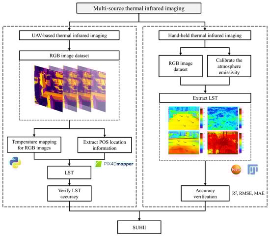 Schematic diagram of the workflow for extracting and processing LST based on the thermal infrared imaging system carried by an unmanned aerial vehicle and a handheld thermal infrared radiometer.