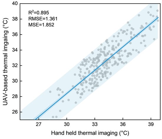 Fitting regression analysis of UAV-based thermal infrared imagery and handheld thermal infrared imagery.
