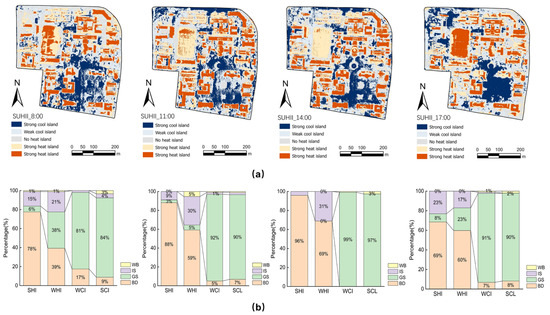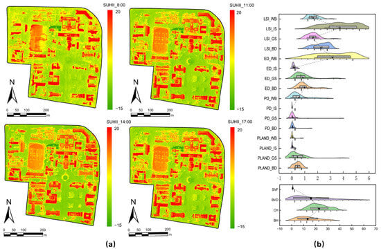 Spatial distribution of SUHII in the study area. (a) The spatiotemporal distribution variations in SUHII in four typical time periods: 8:00, 11:00, 14:00, and 17:00. (b) The SUHII distribution range of campus 2D/3D landscape index.