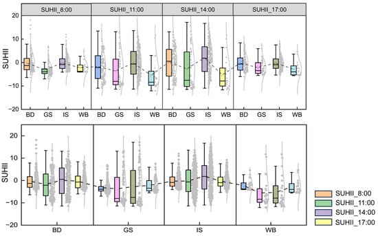 Figure 8 reveals significant differences in the temporal heterogeneity of SUHII under different land use types. Overall, the surface heat island or cool island effect reaches its peak at around noon. Among them, the distribution curve of the SUHII of the impervious surface area shows an inverted U-shaped curve, with the peak point appearing at 14:00, indicating that the impact of impervious surface on SUHI intensity first increased and then weakened. Although the building area exhibits a similar growth trend, the fluctuation amplitude is about 0.728 °C lower than that of the impermeable surface, showing a more stable thermal characteristic. Meanwhile, the SUHII variations in the green area and water area demonstrate a U-shaped curve, performing the peak cooling effect at midday with median SUHII values of −8.304 °C and −7.754 °C, respectively. Although the water body exhibits strong local cooling efficiency. Their limited spatial coverage (merely 1.02% of the campus area) significantly constrains the cumulative heat mitigation potential.