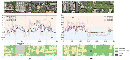 Axis analysis of the SUHII spatial-temporal distribution of the campus-built environment. (a) SUHII distribution on the horizontal axis; (b) SUHII distribution on the vertical axis.